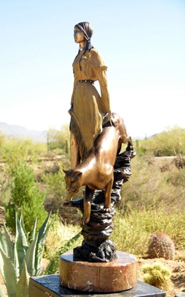 Anne, has in this realistic figurative bronze sculpture combined the culture of the Native American Indian, integrated to their spirit and lives.
